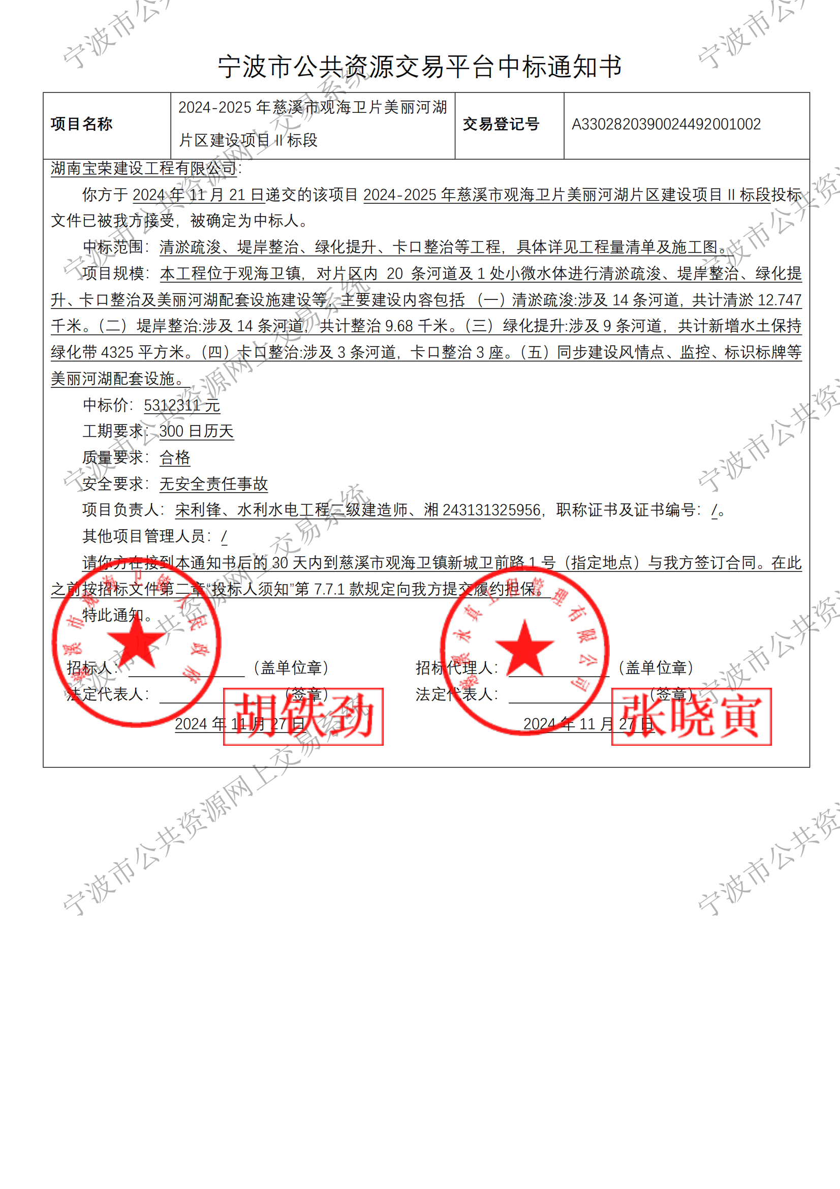 恭祝湖南宝荣建设工程有限公司中标2024-2025年慈溪市观海卫片美丽河湖片区建设项目二标段